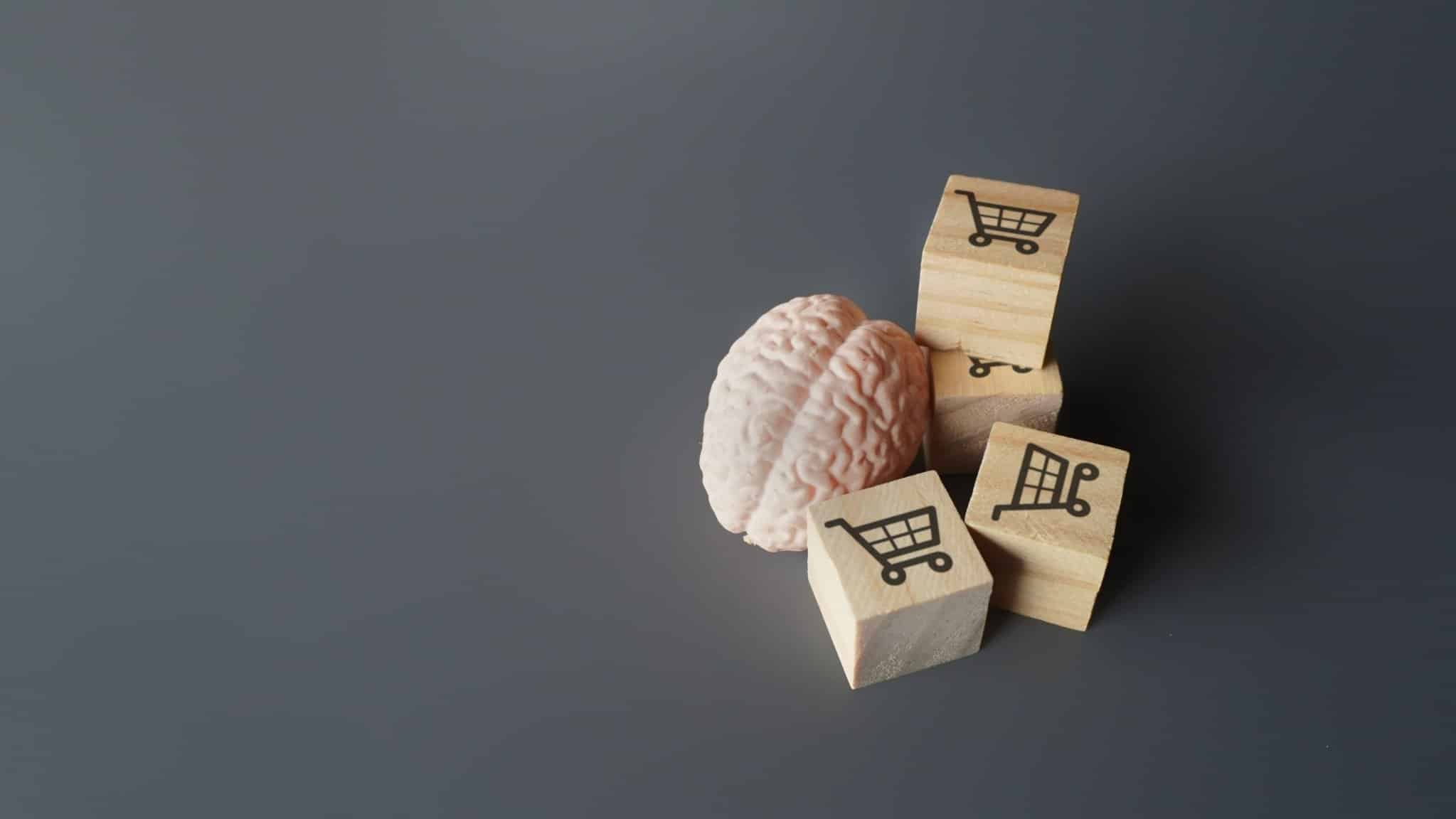 Brain and shopping icons symbolizing psychology of how to stop splurging money.